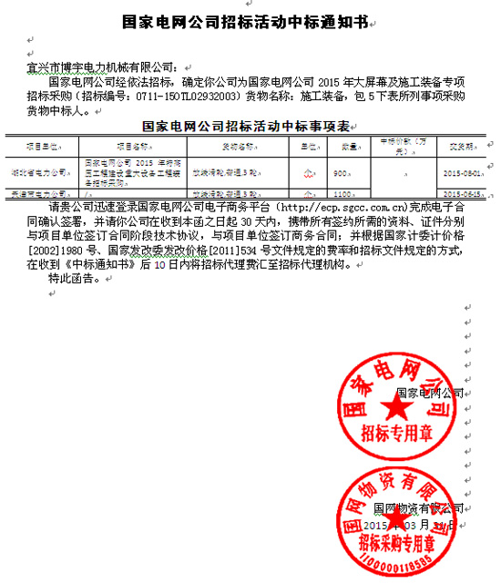 国家电网公司2015年大屏幕及施工装备专项招标采购项目,经过与几家实力雄厚的公司激烈竞标,我公司成功中得该项目放线滑车设备的采购。